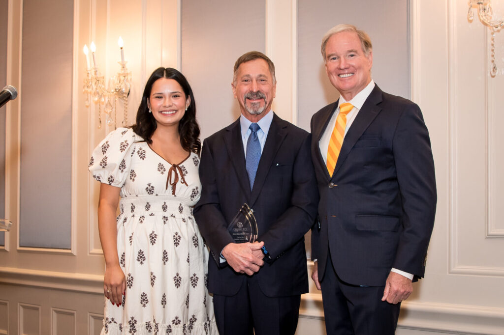 Viviana Gomez (Corporate Work Study Account Manager), Larry Miller (President & CEO, North Dallas Bank and Trust), and Dr. Patrick M. Walsh (President, Cristo Rey Dallas) during the 2025 CEO Breakfast, celebrating the presentation of the Bill Miller Corporate Leadership Award to Larry Miller.